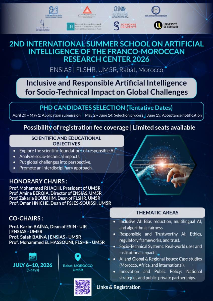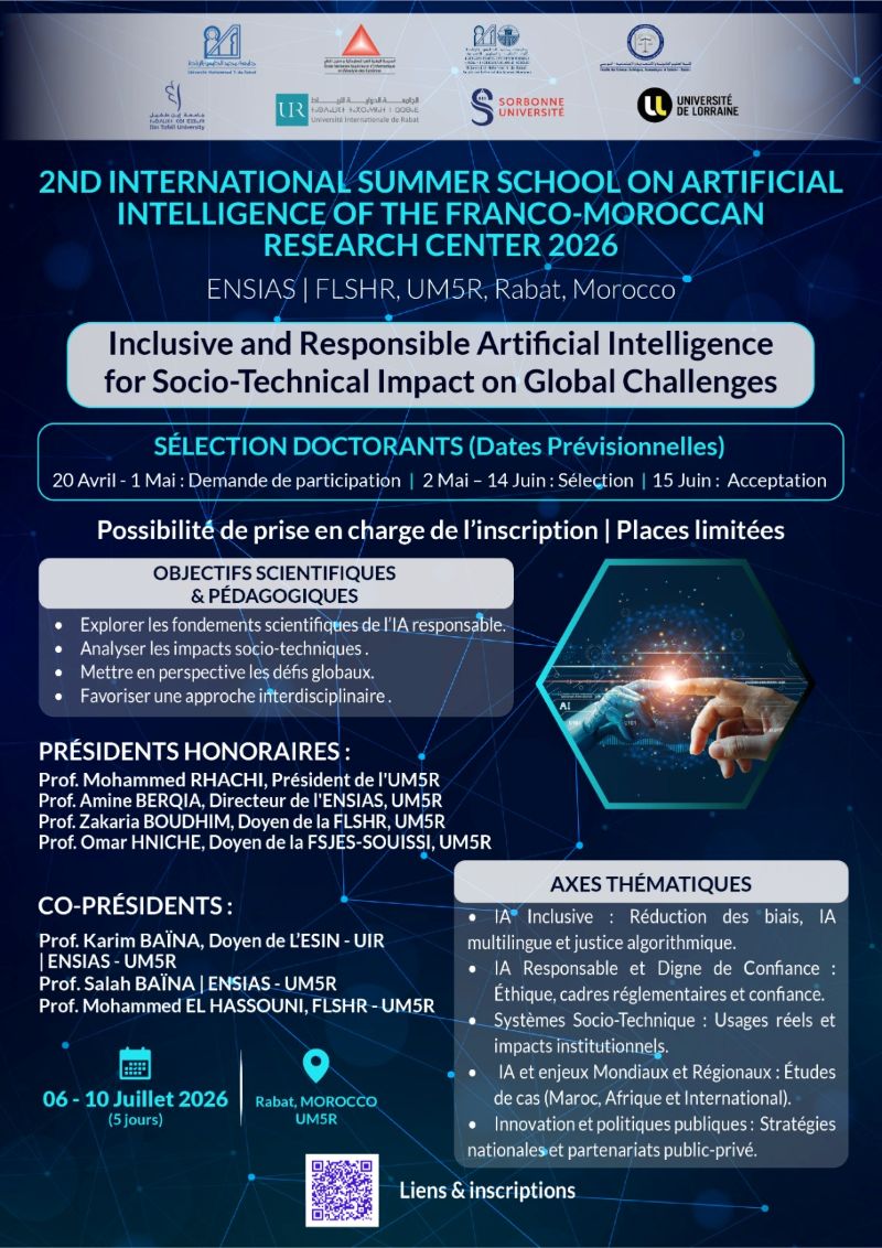 Building on this structured academic cooperation between Morocco and France, the summer school seeks to contribute to the emergence of shared scientific, ethical, and methodological frameworks, supporting the development of inclusive, responsible, and trustworthy AI systems adapted to both global and regional challenges.