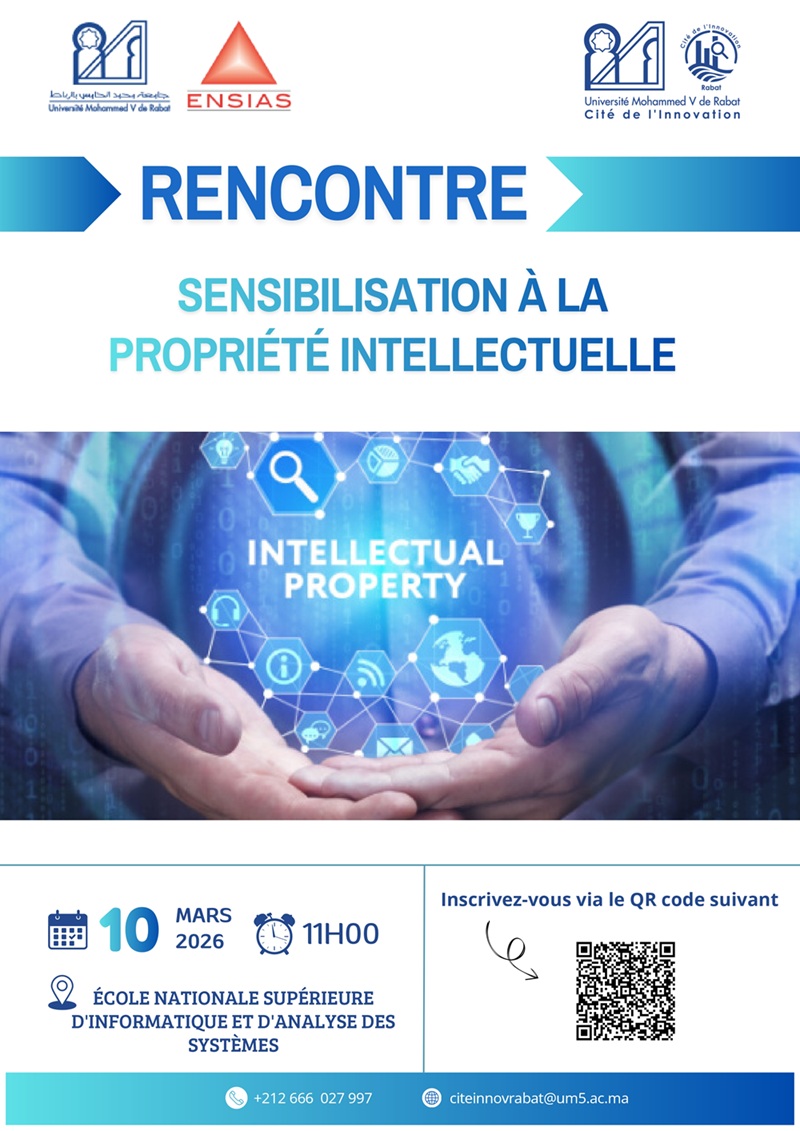 La cité d'innovation de Rabat organise une rencontre de sensibilisation à la propriété intellectuelle au profit des doctorants et des enseignants-chercheurs à l'Ecole Nationale Supérieure d'Informatique et d'Analyse des Systèmes (ENSIAS) le Mardi 10 Mars 2026 à 11h00.